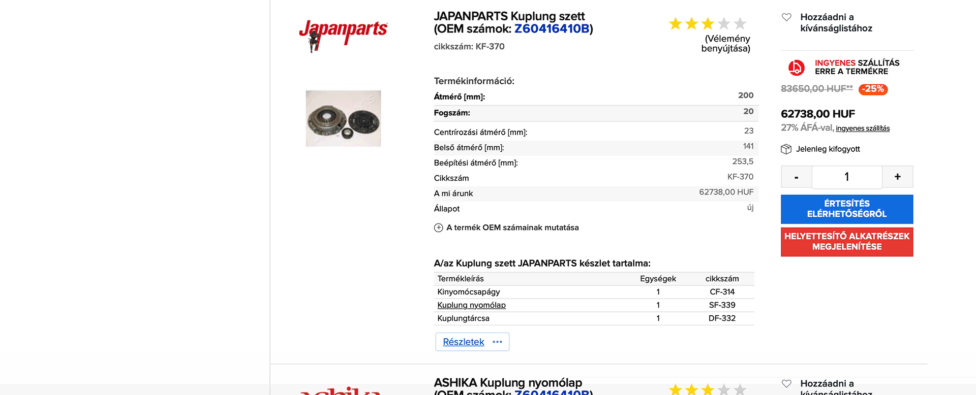Ha az OEM-szám alapján keres alkatrészeket, a helyettesítő termékeket tartalmazó lista jelenik meg. Helyettesítő termék az, amely hasonló vagy azonos jellemzőkkel rendelkezik. Az OEM-szám megadása után ügyeljen arra, hogy összehasonlítsa a listában szereplő helyettesítő alkatrészek jellemzőit. Ha számos keresési eredmény közül kell választania, figyelmesen olvassa el és hasonlítsa össze a helyettesítő alkatrészek jellemzőit az eredeti termék jellemzőivel, vagy forduljon segítségért az ügyfélszolgálathoz. Ha a szükséges alkatrész nincs készleten, használja az "Helyettesítő alkatrészek megjelenítése" gombot. Látni fog egy listát, amely hasonló vagy azonos jellemzőkkel rendelkező, de más márkákból származó alkatrészeket tartalmaz, valószínűleg különböző árkategóriákban.